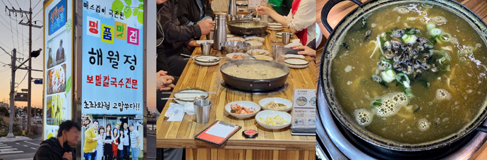 미니버스를 타고 천천히 제주공항 근처로 향했습니다. 이제 저녁식사를 하고 탑승수속을 하면 됩니다. 버스 사장님의 소개로 공항 근처 보말 칼국수 "해월정"이라는 식당에 도착했고 우리는 보말칼국수를 주문해서 맛있게 먹었습니다.
