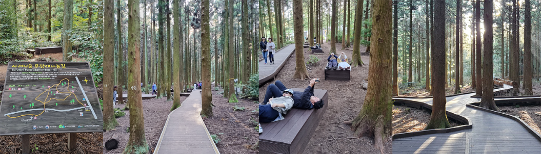 사려니숲 무장애 나눔길은 건강에 좋은 피톤치드를 마음껏 마실 수 있는 숲 속이어서 너무 좋았습니다. 조금씩 여행길에 지친 몸들을 쉬고 싶어 데크 위로 편하게 누울 수 있어서 좋았습니다. 이곳 숲길은 제주도 중부 내륙으로 한라산을 관통하는 일명 516 도로를 따라 서귀포 방향으로 가는 길에 위치하고 있습니다. 많은 사람들의 모습이 보입니다. 오늘 또 한 번 제주도의 핫 플레이스를 경험하고 갑니다.