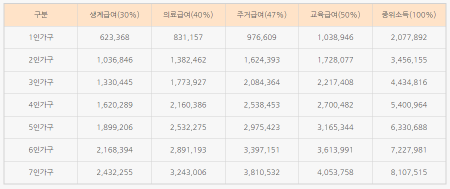 - (변경) 1인가구 623,300원, 4인가구 1,620,200원